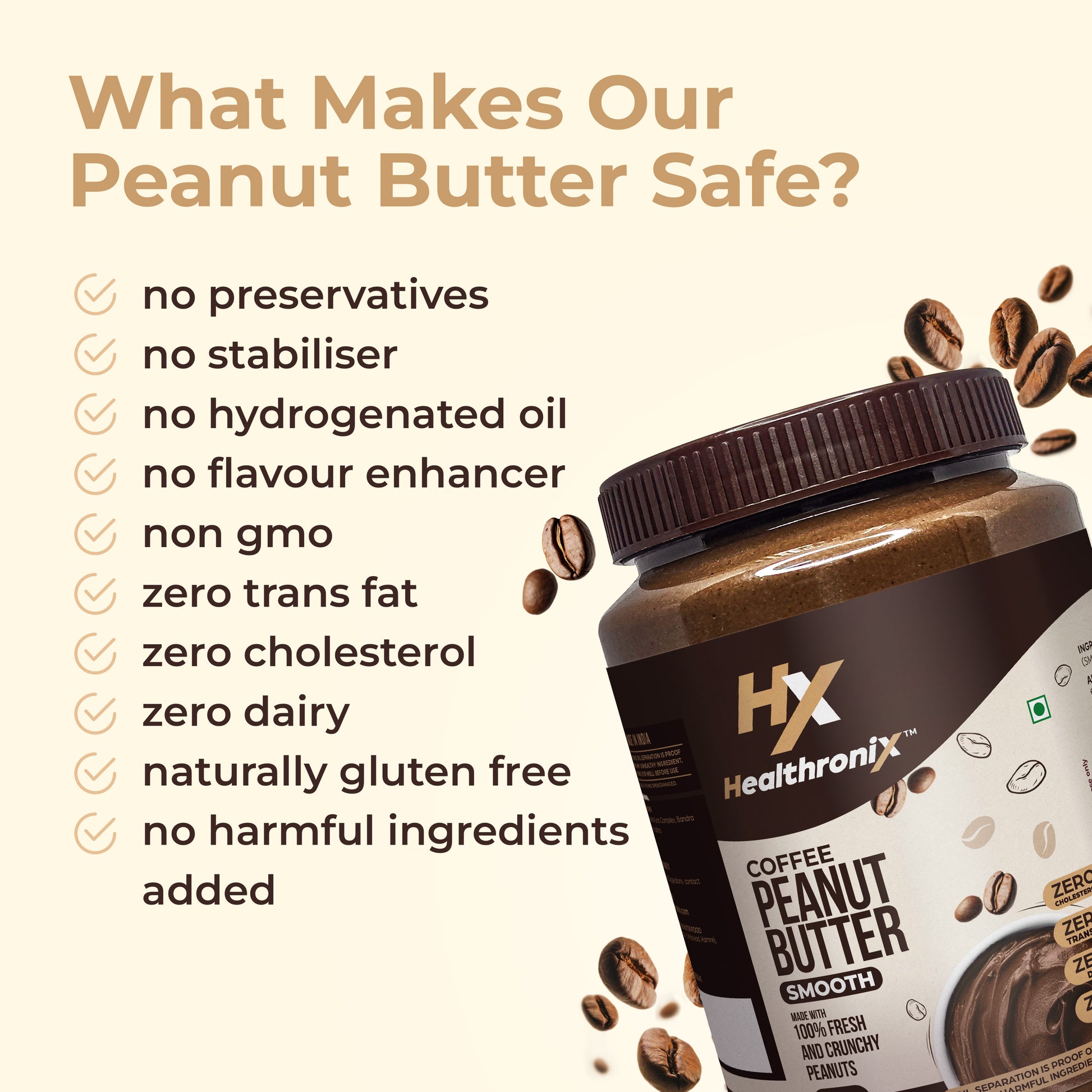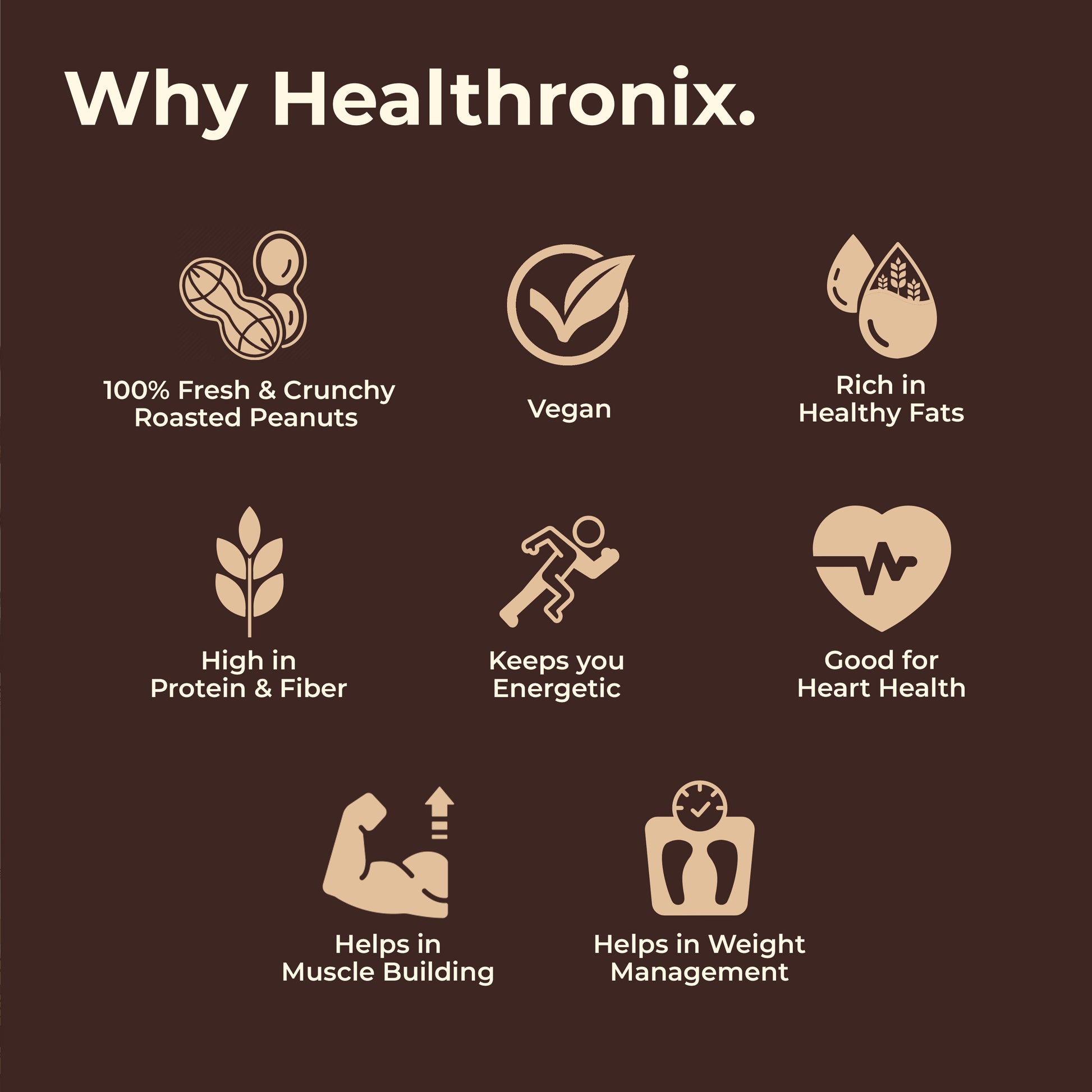 Healthronix Coffee Smooth is crafted for coffee lovers who crave an energising, aromatic boost — roasted peanuts blended with natural coffee and milk solids for a creamy, melt-in-mouth experience. Packed with protein and healthy fats, it fuels gym-goers, fitness enthusiasts, women, mothers, kids, and families. Perfect as a pre-workout or post-workout energy snack, a midday pick-me-up, a tiffin box addition, or even a late-night indulgence. Spread on toast, mix into shakes, or stir into oats and recipes for a rich, energising coffee experience — truly Health for All.